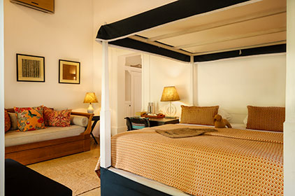 We have two suites in the main house with large king beds, with an ante room which can accommodate two extra single beds, perfect if you want to be close to but not share a bedroom with your children. This is available for those with children between the ages of 3 and 12, cots for infants are available and will be provided with no extra charge. An over-sized bathroom with large walk in shower makes this a perfect room for families.