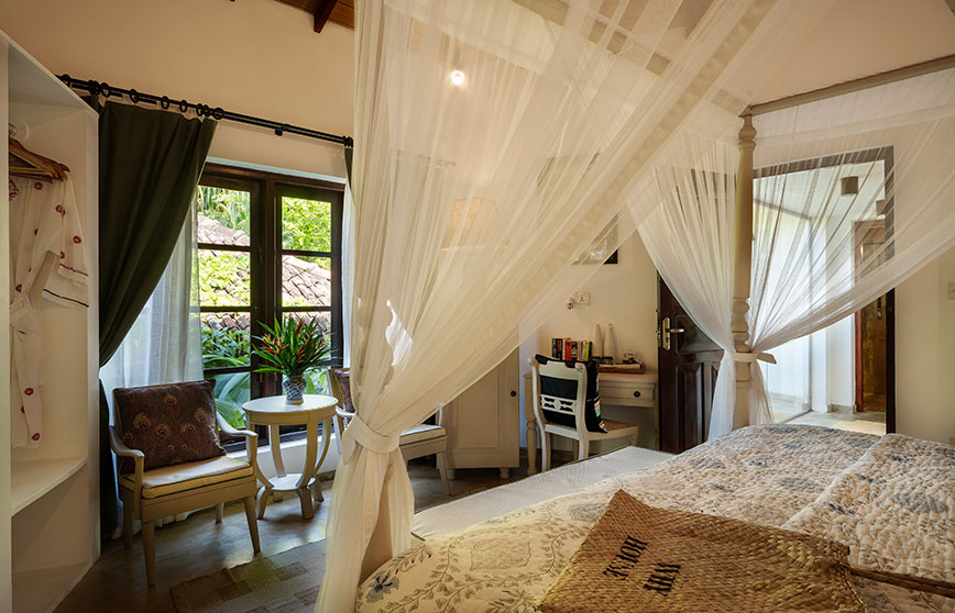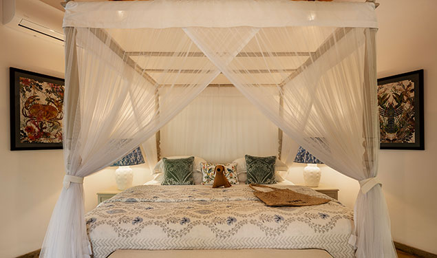 We have two separate cabanas, each with split king beds. The Pool View has a small third bed for a child with enclosed garden and outdoor seating. The Paddy View is suitable for a couple with a terrace and sunbathing area.