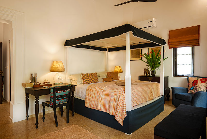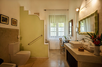 We have two suites in the main house with large king beds, with an ante room which can accommodate two extra single beds, perfect if you want to be close to but not share a bedroom with your children. This is available for those with children between the ages of 3 and 12, cots for infants are available and will be provided with no extra charge. An over-sized bathroom with large walk in shower makes this a perfect room for families.